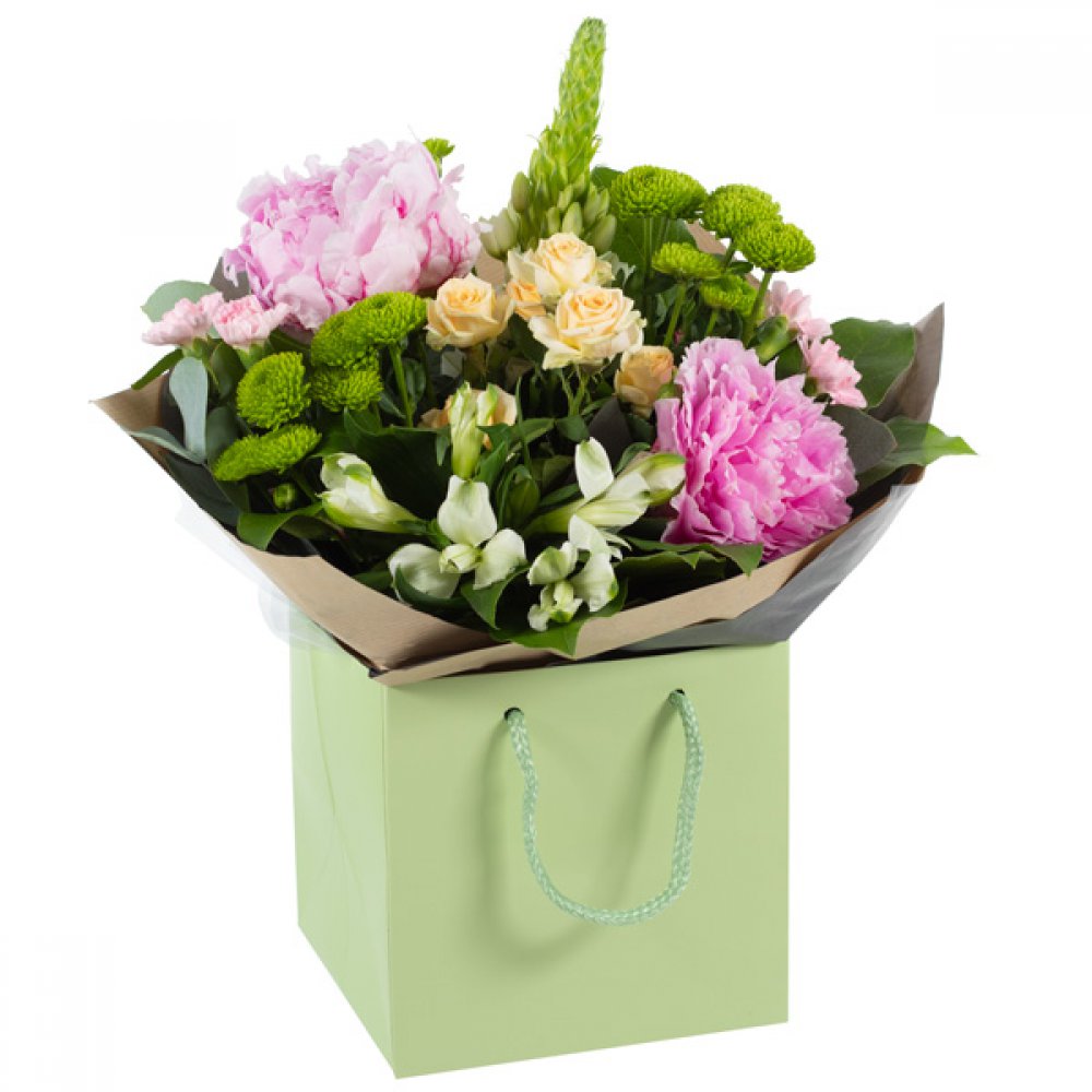Subtle and sweet is the aura of this handtied. Containing a mixed collection of seasonal flowers and peonies.