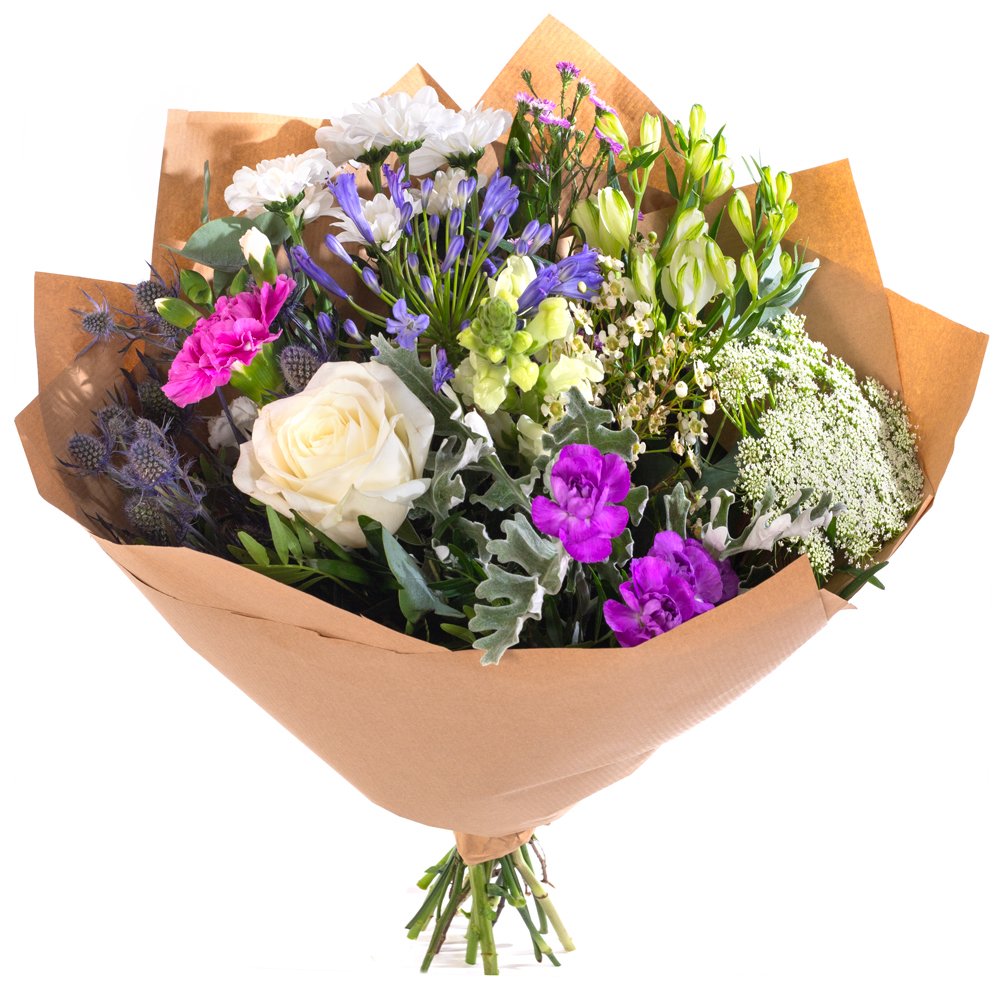 Soft and serene, Lavender Fields combines gentle shades of lilac, purple, and white with green foliage for a beautifully balanced design. A stylish arrangement that feels both modern and timeless, adding quiet elegance to any setting.