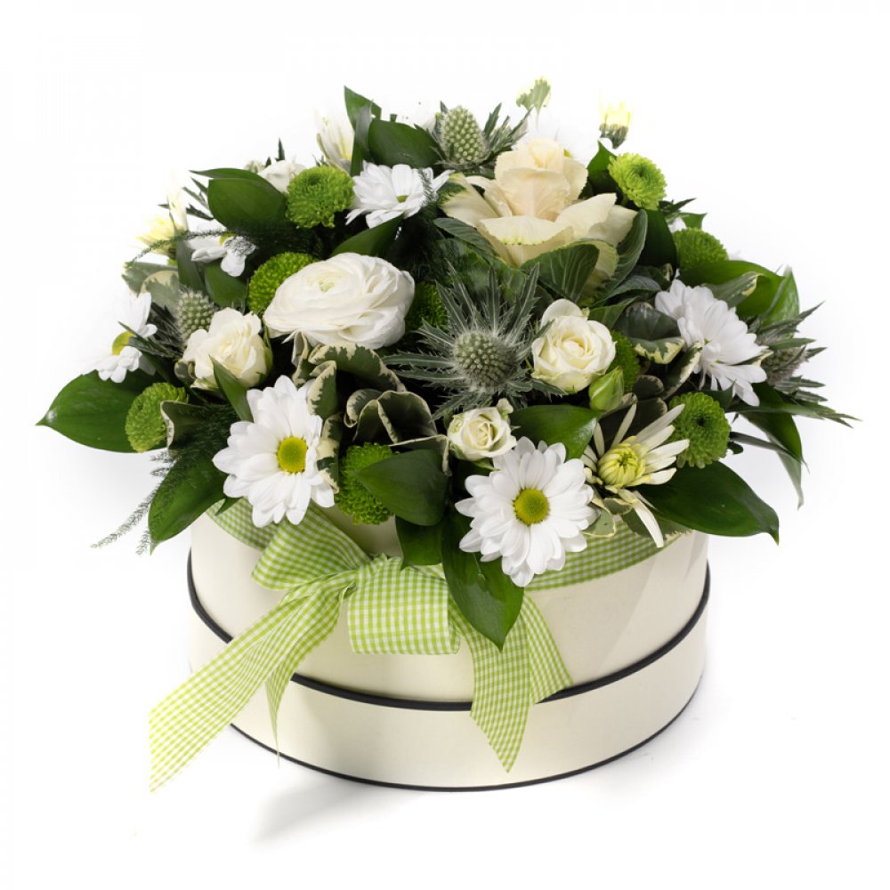 A stunning arrangement of luxurious flowers in a white & cream colourway. Made to impress in a stylish hat box.